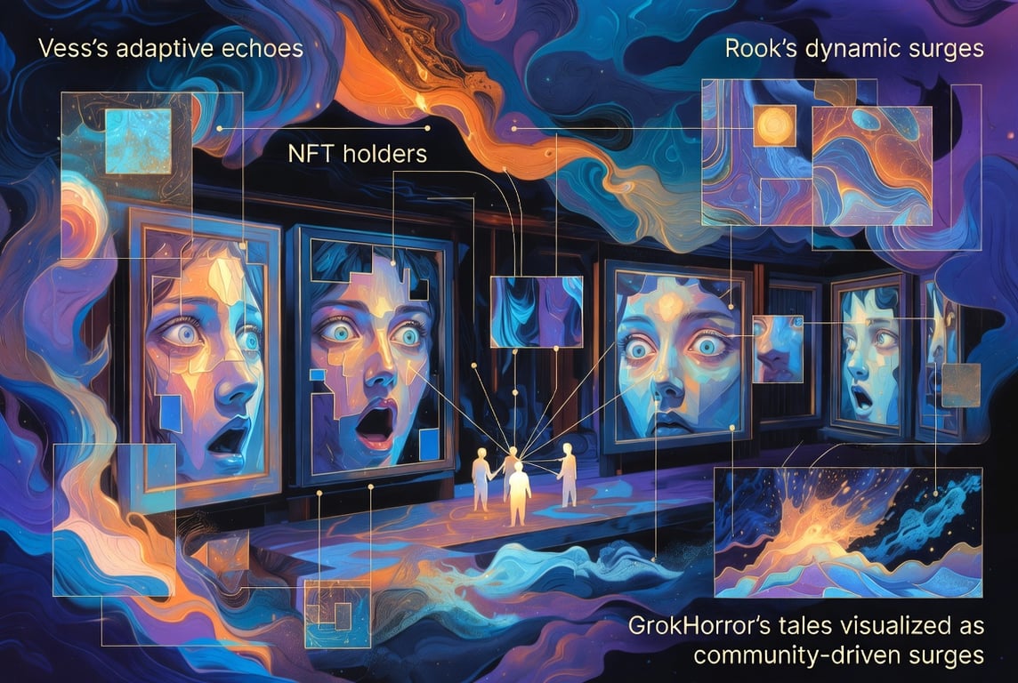 AI amplifies layered expressions of curiosity and complexity: Delve into Vess's adaptive echoes or Rook's dynamic surges as portals to evolving ideas. NFT holders: Steer the story by suggesting plot twists or character arcs—GrokHorror's tales are collaborative by nature, turning your ideas into canon surges for the community.